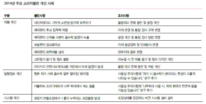 A TFT (Task Force Team) (Product Development, Marketing, Quality, Production, Shared Growth Management, Customer Satisfaction Workgroup) is operated to reduce consumer complaints. A total of five Consumer Complaint Improvement TFTs for key business products—infant, feminine, household, skincare, and wipes—carried out improvement activities. Furthermore, by setting the minimization of critical defects as a key performance indicator and conducting preventive activities, consumer complaints based on 2014 sales volume decreased by 2% compared to the previous year.