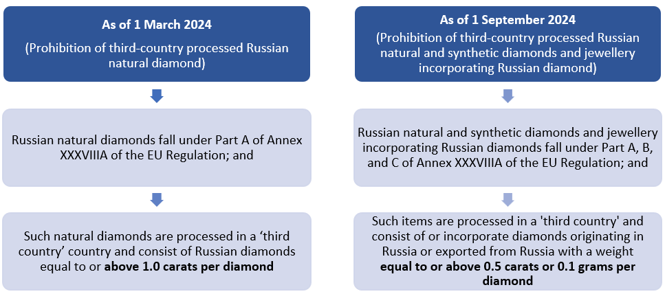 The EU’s restrictions on imports of Russian natural diamonds (rough and polished) and jewellery processed in third countries are set out in EU Regulation (EU) 833/2014 (EU Regulation), and apply in different stages.
