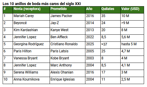 Other notable figures in the ranking include Jennifer Lopez, who received a rare 8.5-carat green diamond valued at over $5 million from Ben Affleck, and Georgina Rodríguez, fiancée of Cristiano Ronaldo, whose oval ring of approximately 37 carats is estimated at up to $5 million. Also appearing are Paris Hilton, with a 25-carat canary diamond ($4.7 million); Vanessa Bryant, who after a marital crisis received an 8-carat purple diamond valued at $4 million from Kobe Bryant; Jennifer Lopez again, this time with the 8.5-carat blue ring that Marc Anthony gave her in 2004 ($4.1 million); Serena Williams, who wears a 17-carat ring valued at $3 million; and Anna Kournikova, whose 11-carat pink diamond is valued at $2.5 million.
