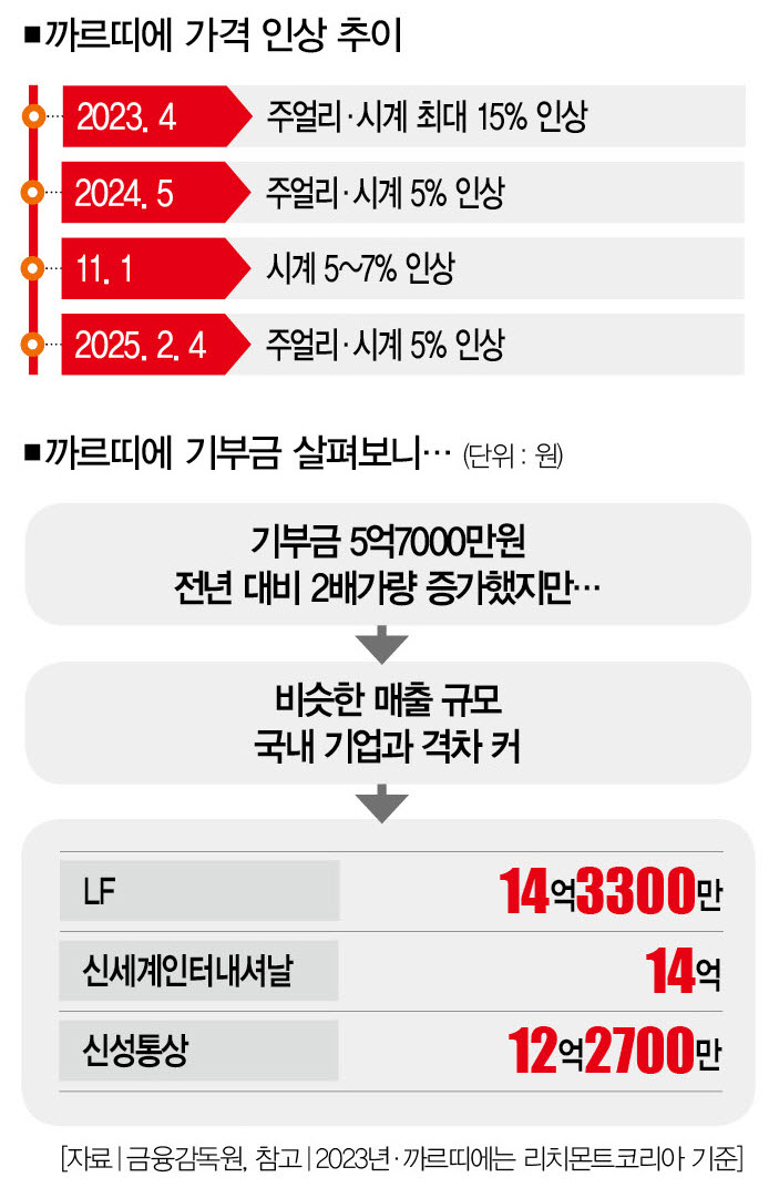 Shinsegae International’s donations last year were 1.4 billion won (sales in parentheses: 1.3543 trillion won), LF’s were 1.433 billion won (1.9007 trillion won), and Sinsung Tongsang’s were 1.227 billion won (1.5425 trillion won), all about double that of Richemont Korea. This is why there are criticisms that “the luxury brand Cartier has lost its dignity in the Korean market.”