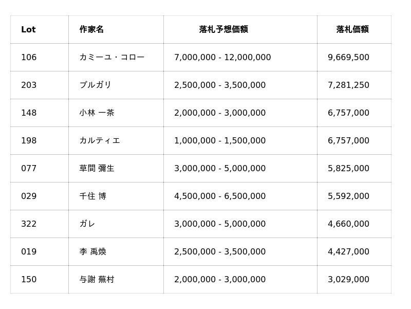 A total of 367 lots were offered. Against a total pre-sale estimate of 300 to 420 million yen, the final hammer price (including buyer’s premium) reached approximately 940 million yen, significantly exceeding initial expectations and resulting in a highly active sale.