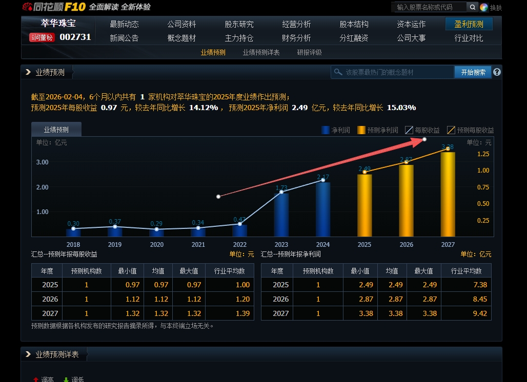 The gains for Cuihua Jewelry’s gold and lithium dual businesses as of February 2026 are significantly higher than the data from August 2025. Gold has risen from over $3,000 per ounce to over $5,000 per ounce. Lithium has increased from tens of thousands of yuan per ton to over one hundred thousand yuan per ton. The first-quarter report is expected to show explosive growth. Personal forecast: The combined profit from the gold and lithium businesses in Q1 is expected to be 2-3 billion yuan, plus an additional 4-5 billion yuan in compensation from a shareholder surnamed Chen for failing a performance bet, resulting in a net profit range of 2-8 billion yuan.