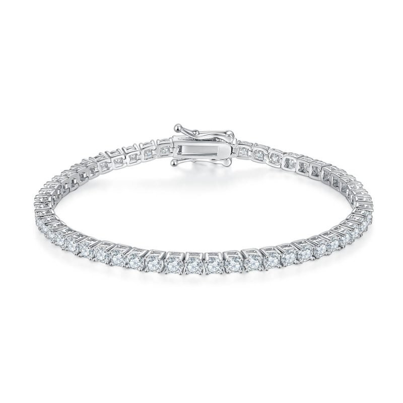 Ce bracelet de tennis intemporel présente des moissanites rondes de couleur D et pureté VVS, proposées en tailles de 3,00 mm, 4,00 mm ou 5,00 mm. La pièce est habilement fabriquée en argent sterling plaqué or blanc 18 carats, garantissant une finition durable et brillante. Il est présenté dans une élégante boîte à bijoux. Des options de personnalisation sont disponibles sur demande.