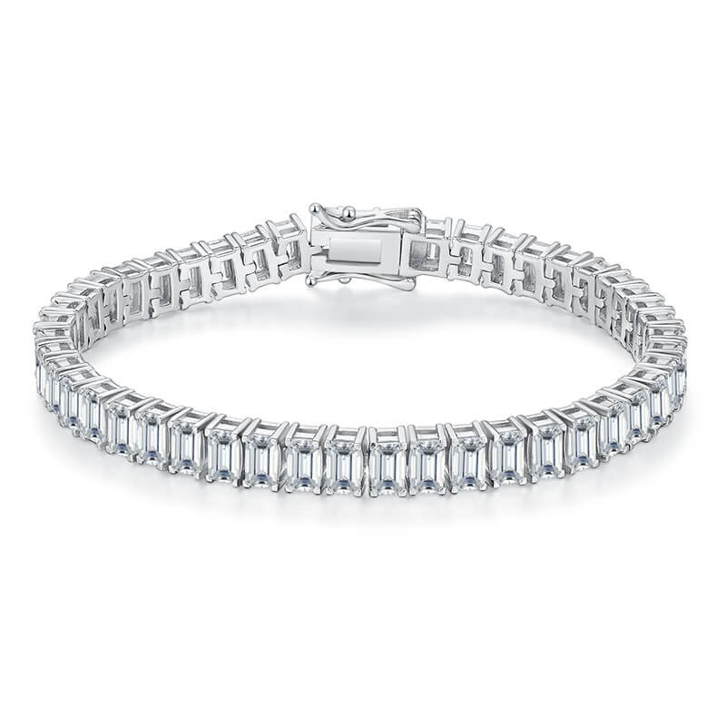 Esta elegante pulsera de tenis exhibe una línea continua de piedras de moissanita corte esmeralda, cada una de aproximadamente 0.5 quilates, con color D y claridad VVS para un brillo excepcional. Las piedras están montadas de forma segura en plata de ley bañada en rodio, proporcionando un acabado blanco brillante y durabilidad duradera. El diseño es clásico y versátil, adecuado para cualquier ocasión. La pulsera está disponible en múltiples longitudes para garantizar un ajuste perfecto. Se presenta en una fina caja de joyería, lista para regalar o para la venta al por menor.