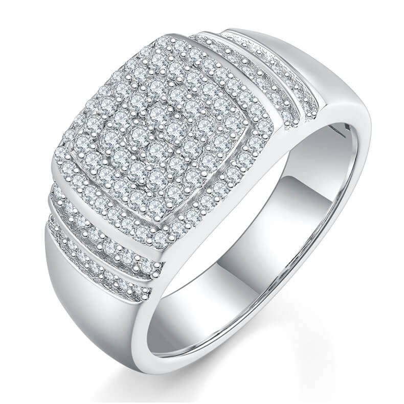 Cette bague homme luxueuse présente 0.82 carats de pierres melee de moissanite rondes, couleur D et pureté VVS, serties dans de l'argent 925 plaqué or blanc 18 carats. La pièce est fabriquée avec un savoir-faire de précision pour une finition premium. Elle est présentée dans un élégant écrin à bijoux. La moissanite provient de Wuzhou, Guangxi, Chine, et est fournie par cinq entreprises de transformation locales. La densité du matériau est de 3.21-3.22, et il est destiné au sertissage de bijoux.