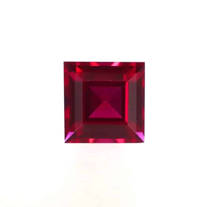 This square step-cut lab-grown ruby displays a rich gem red to pigeon blood red color. It features an excellent cut and VS-VVS clarity for high brilliance. Sizes range from 3x3mm to 15x15mm. Each stone is certified by AGL/GRC. Custom cutting is available upon request. The chemical composition is Al2O3 with a hardness of 9.0, a refractive index of 1.76-1.77, and a specific gravity of 3.99-4.05.