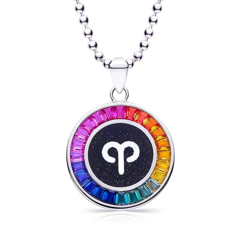 This Aries zodiac pendant necklace showcases a vibrant rainbow synthetic gemstone, set in rhodium-plated sterling silver for lasting shine. The 45cm chain is crafted with fine workmanship, ensuring durability and a comfortable fit. It arrives presented in an elegant gift box, ready for gifting. The piece is produced by 3 Wuzhou gemstone processing enterprises.